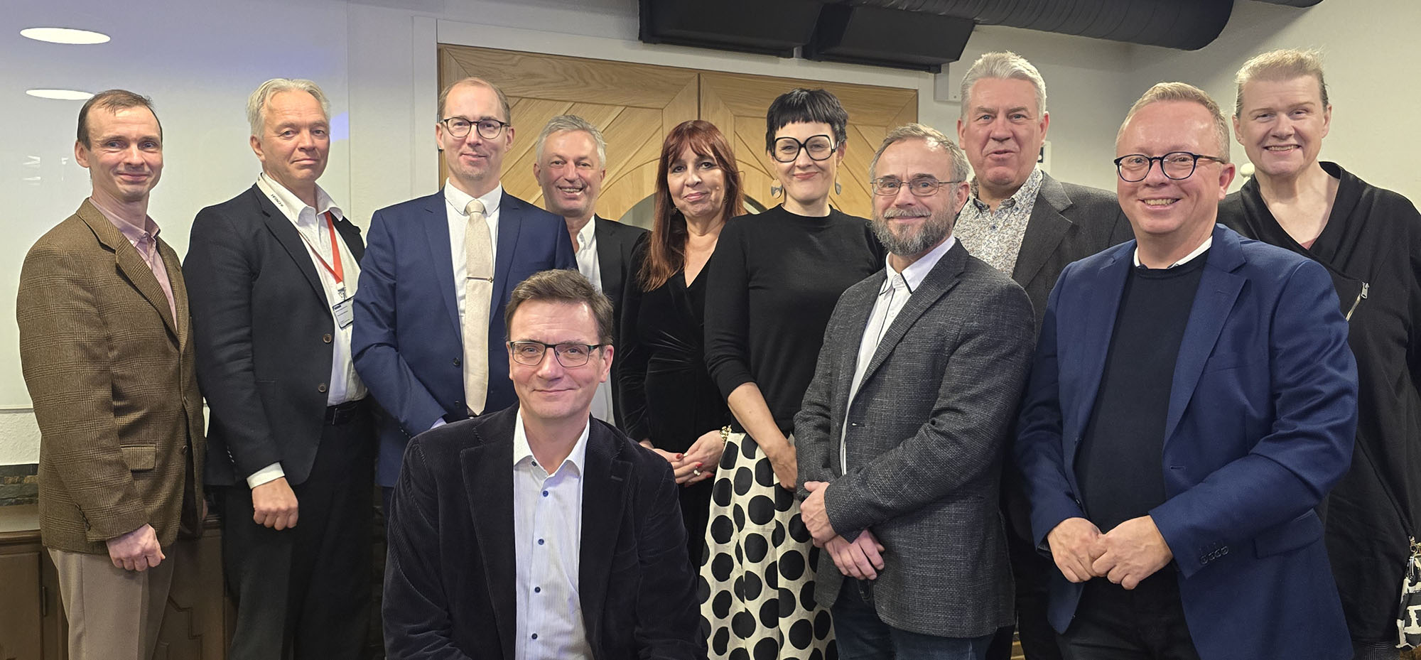 Kuvassa Länsirannikkoyhteistyön Industrial Advisory Boardin jäseniä, jotka kokoontuivat Vaasassa 3.12.2025 yhteistyön juhlaseminaarin yhteydessä. Vasemmalta Otto Långvik, Timo Keski-Valkama, Nicklas Södö, Kai Kamila, Marja-Riitta Vest, Johanna Krappe, Marko Forsell, Juhani Soini, Ilkka Rytkölä, Jaana Pullola ja edessä Vesa Taatila. Kuva: Vaasan ammattikorkeakoulu.