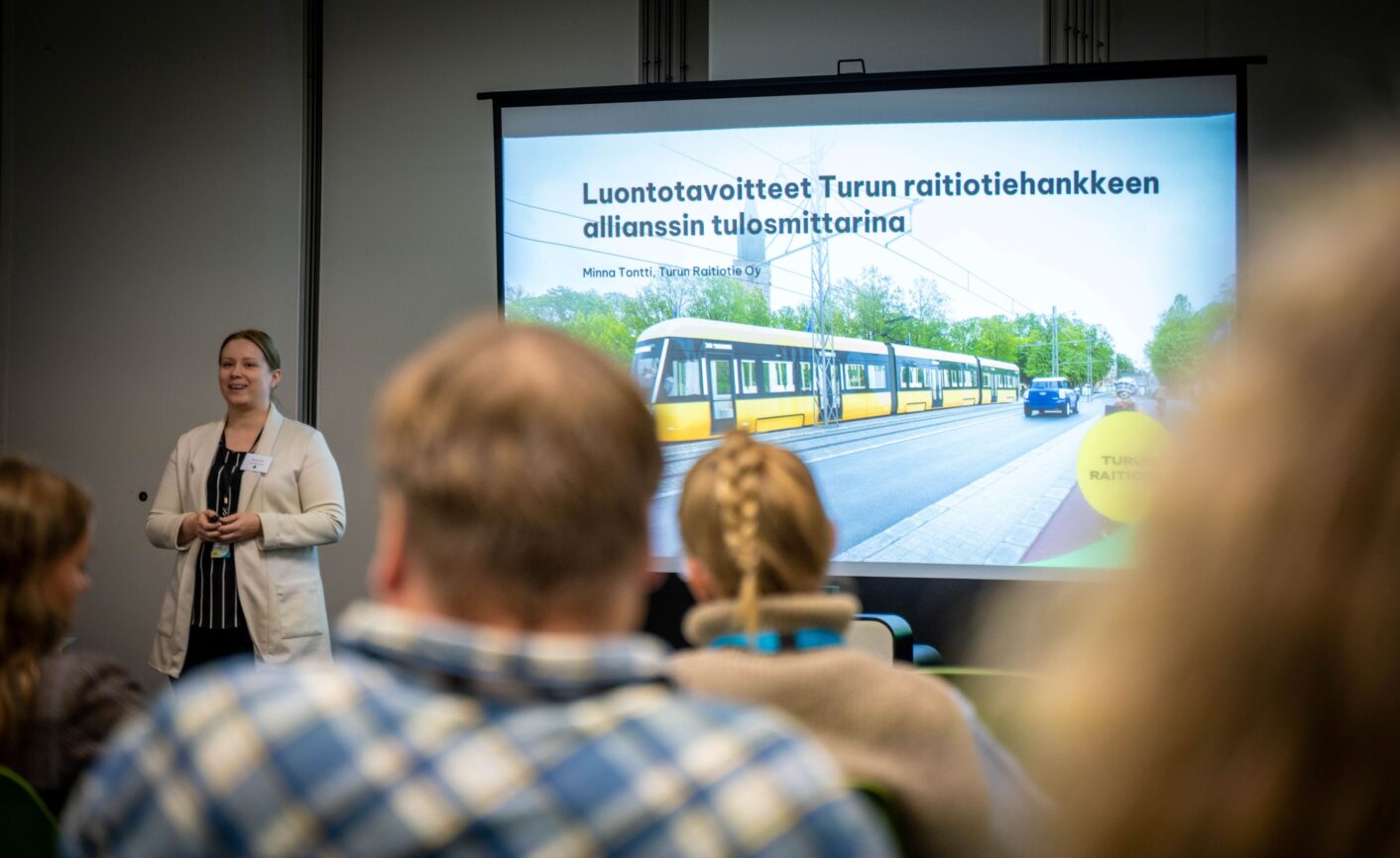 Turun Raitiotie Oy:n ympäristö- ja vastuullisuuspäällikkö Minna Tontti esitteli raitiotiehankkeen allianssimallia yhtenä esimerkkinä luontotavoitteiden huomioimisesta toteutussuunnitteluvaiheessa. Raitiotiehankkeessa luontotavoitteet ovat osa tulosmittaristoa.
