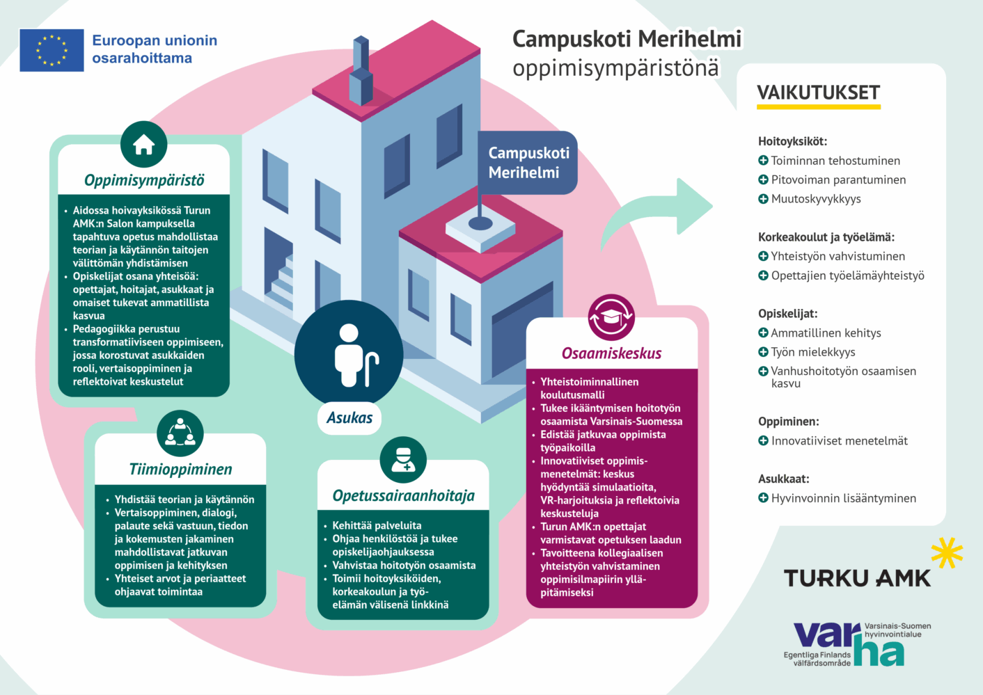 Projektissa kehitetään Turun ammattikorkeakoulun sairaanhoitajaopiskelijoille uusi työharjoittelun osaamismalli, jonka avulla vastataan työelämän muutoksista aiheutuviin osaamistarpeisiin sekä nostetaan ikääntyneiden hoitotyön osaamistasoa. Mallia pilotoidaan sen kehittämisen yhteydessä Varsinais-Suomen hyvinvointialueella, ikäihmisten ympärivuorokautisessa palveluasumisyksikössä Campuskoti Merihelmessä. Tavoitteena on innostaa tulevia hoitotyöntekijöitä työllistymään ikääntyneiden hoivatyöhön ja antaa heille valmiuksia toimia vaativalla erikoisalalla.