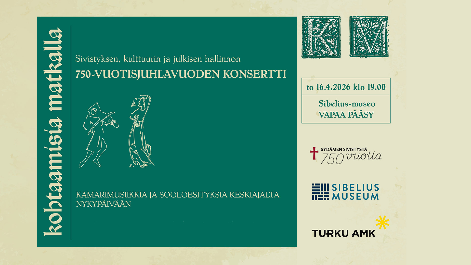 Sivistyksen, kulttuurin ja julkisen hallinnon 750-vuotisjuhlavuoden konsertti. Konsertissa kuullaan kamarimusiikkia ja sooloesityksiä keskiajalta nykypäivään. Taiteilijoina Turun Taideakatemian musiikinopiskelijoita ja opettajia.