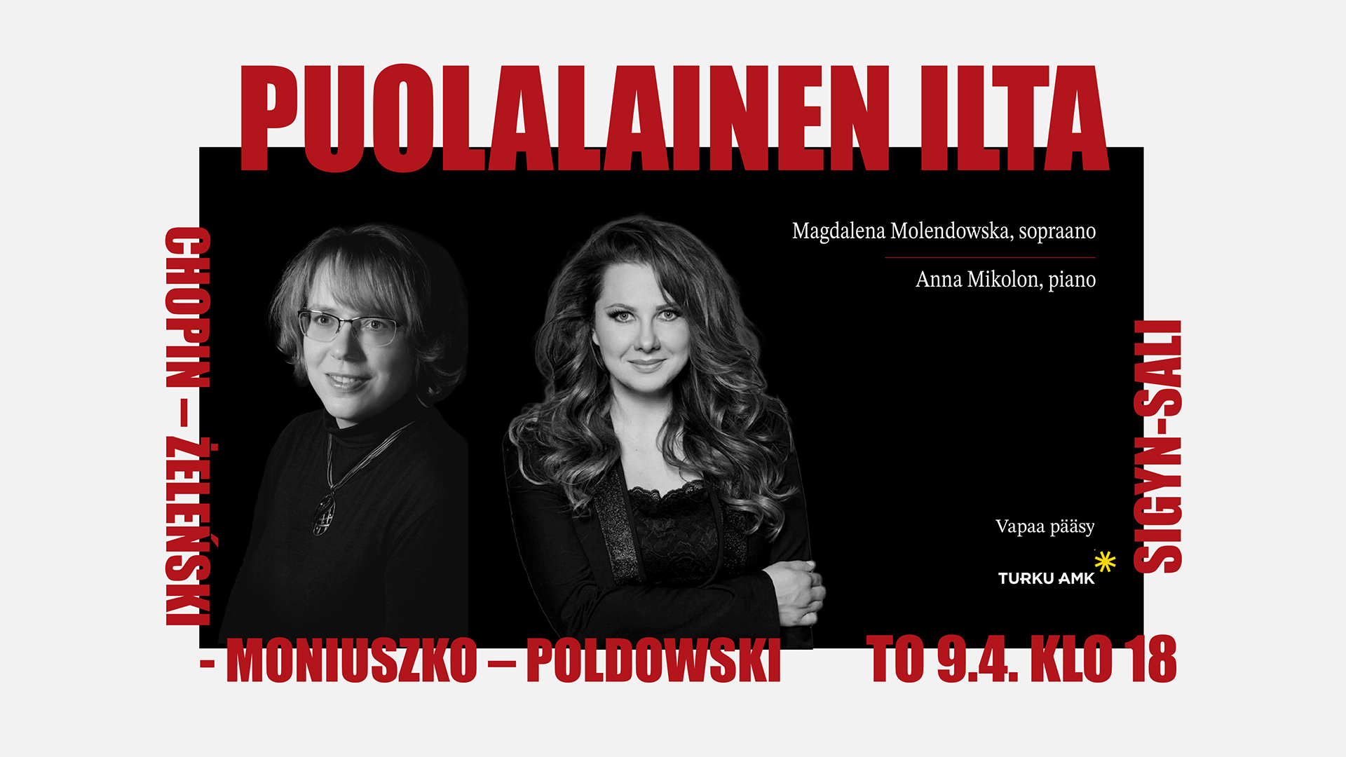 Gdanskin musiikkiakatemian (Akademia Muzyczna im. Stanisława Moniuszki w Gdańsku) professorit sopraano Magdalena Molendowska ja pianisti Anna Mikolon vierailevat Turun AMK:n Taideakatemiassa Erasmus-vaihdossa. He konsertoivat Sigyn-salissa to 9.4. klo 18. Konsertin ohjelmassa on puolalaista laulumusiikkia mm. seuraavailta säveltäjiltä Fryderyk Chopin, Władysław Żeleński, Antoni Kątski ja Stanisław Moniuszko.
