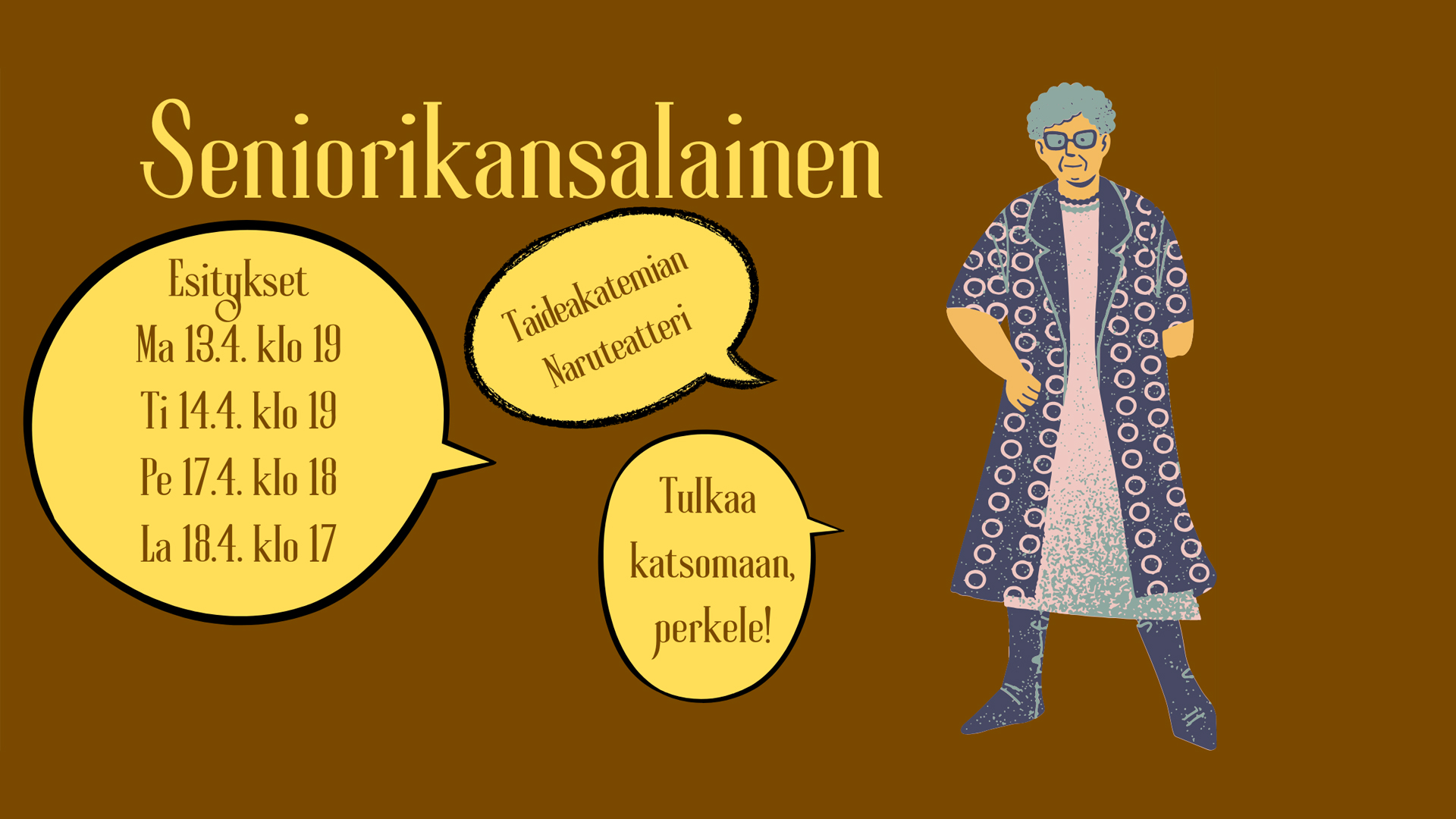 Tuula, 80, yrittää selviytyä nyky-yhteiskunnan muutosten pyörteissä. Temptation Island, ruokarobotti, Zoom-istunnot… mitä vielä? Onneksi sarjakuvat ovat ja pysyvät. Absurdi tragikomedia Tuulan arjesta, jossa välähdykset 60-luvulta punoutuvat mukaan. Esityksen ideointi on herättänyt runsaasti keskustelua työryhmässä ja tuonut mieleen muistoja rakkaista, hullunkurisista edesmenneistä isovanhemmista.