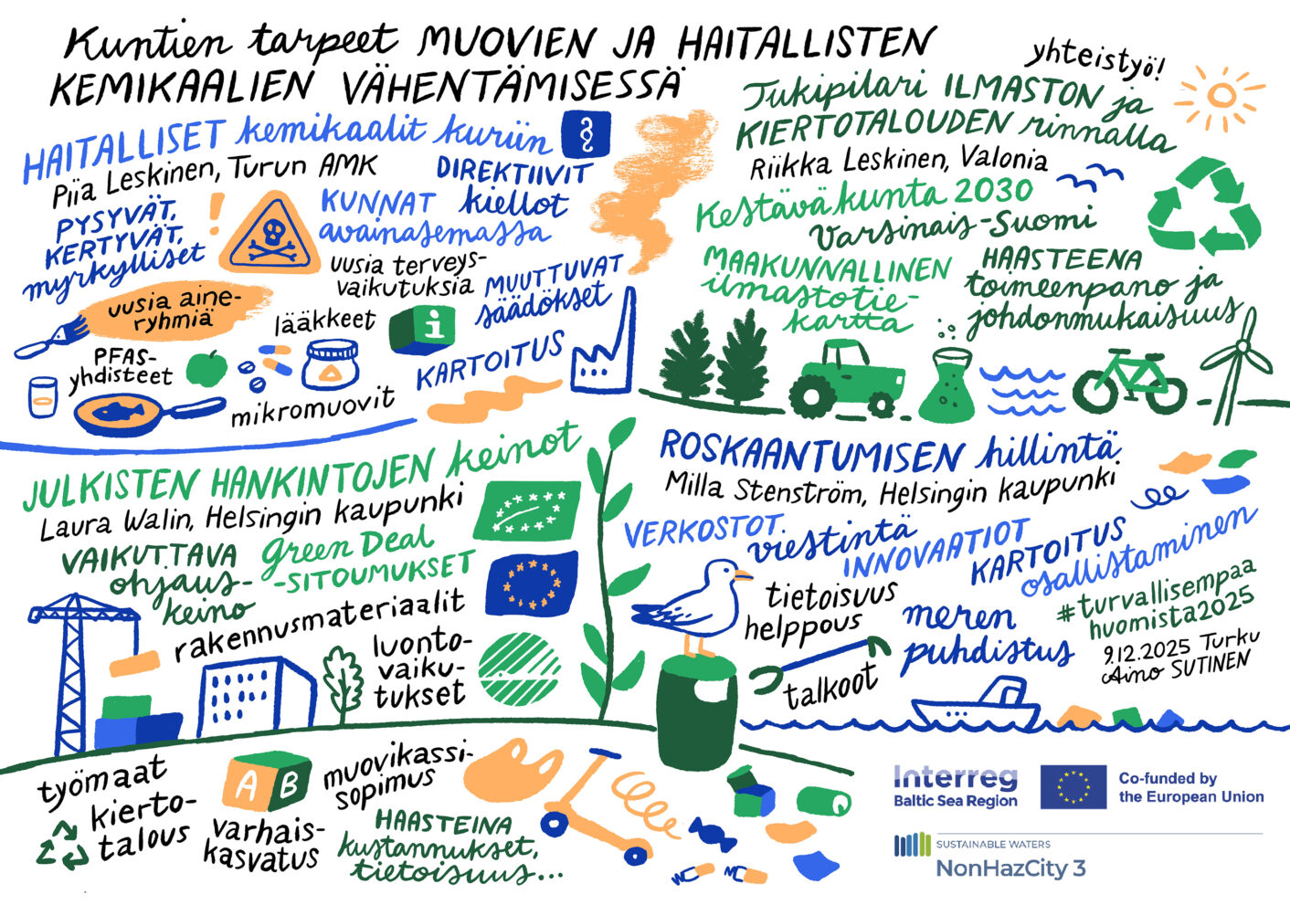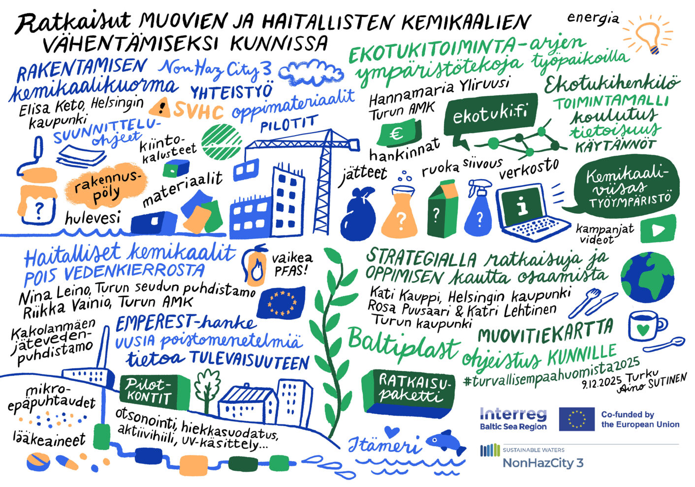 9.12.2025 Turun AMK:n tiloissa järjestetty Turvallisempaa huomista -tapahtuma kokosi yhteen useiden TKI-hankkeiden tulokset (BALTIPLAST, NonHazCity 3, EMPEREST, LIFE Chembee) sekä tarjosi näkökulmia Suomen tilanteesta, tulevista toimenpiteistä ja kansallisista ratkaisuista haitallisten kemikaalien ja muovin vähentämiseen. Tapahtuman kohderyhmänä olivat kunnat, viranomaiset, jätehuolto, tutkijat ja konsultit. Tavoitteena oli yhdistää kunnat ja asiantuntijat konkreettisten työkalujen ja ratkaisujen äärelle, tarjota ajankohtaisia puheenvuoroja ja tutkimustuloksia mikromuoveista, PFAS-yhdisteistä ja muista haitallisista kemikaaleista sekä tuoda helposti saataville TKI-hankkeiden tarjoamia työkaluja, koulutussisältöjä ja muita materiaaleja kunnille.